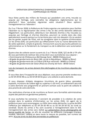 Nous vous informons que les particuliers qui souhaiteraient abandonner des armes blanches ou à feu sont invités à se rendre dans les points de collecte dont vous trouverez la liste dans le communiqué de presse.