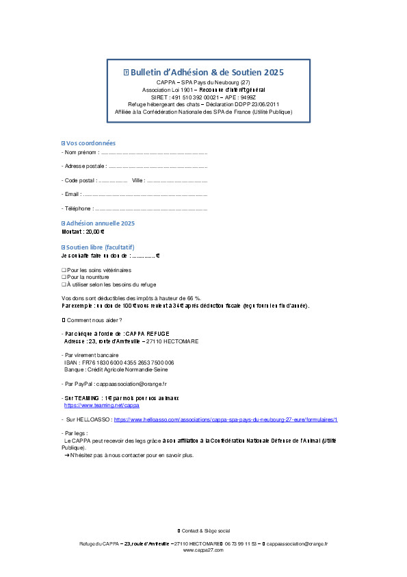 Un reçu CERFA pour les adhésions (20 € annules) et/ou les dons