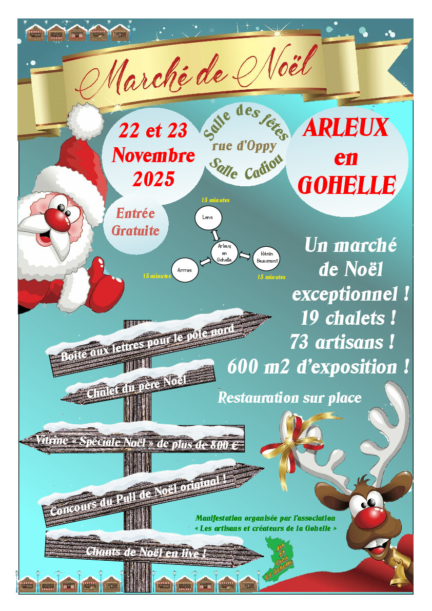 L'association "Artisans et Créateurs de la Gohelle" et la commune d'Arleux-en-Gohelle organisent son marché de noël, les 22 et 23 novembre prochains. Il s'agit de la 5ème édition, et compte tenu du succès grandissant au fil des ans, une dimension toute particulière lui sera consacrée cette année avec la venue de 73 exposants et l'installation de 19 chalets en bois. De nombreuses animations sont également prévues durant ces 2 jours.