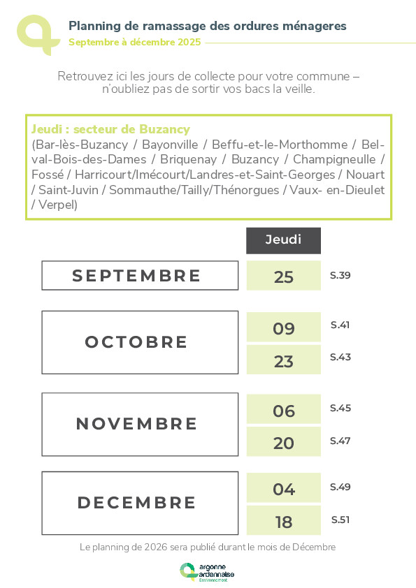 Pour Nouart, le ramassage se fera les jeudis 25 septembre, 9 et 23 octobre, 6 et 20 novembre et, 4 et 18 décembre 2025.