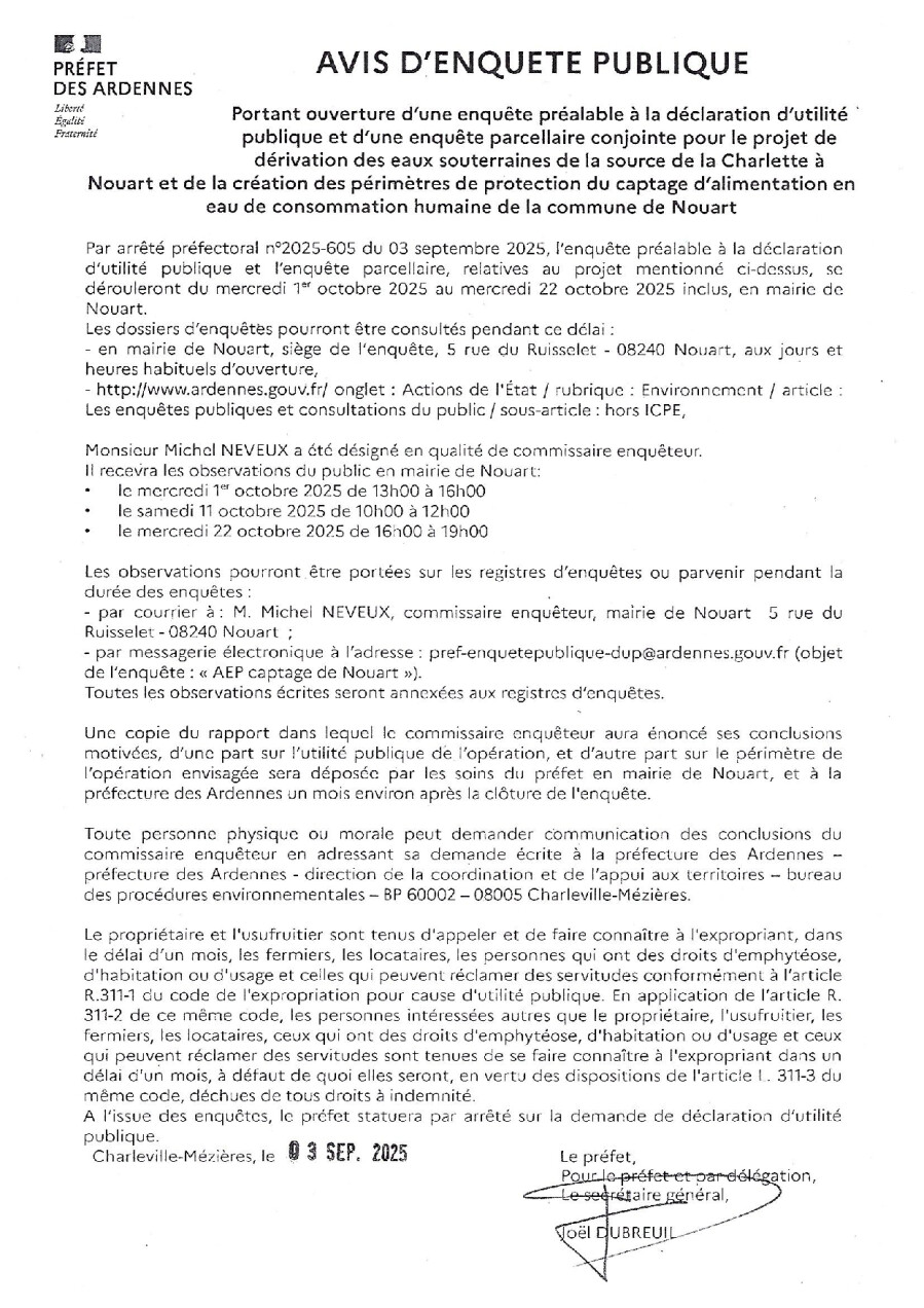 - une enquête parcellaire conjointe pour le projet de dérivation des eaux souterraines de la source de la Charlette à Nouart et la création des périmètres de protection du captage d'alimentation en eau de consommation humaine de la commune de Nouart