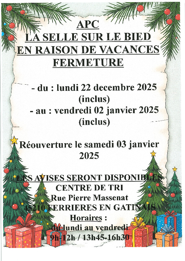 Le Pôle Administratif et le Pôle Technique seront fermés du mercredi 24 décembre à 12h au vendredi 2 janvier 2026 inclus.