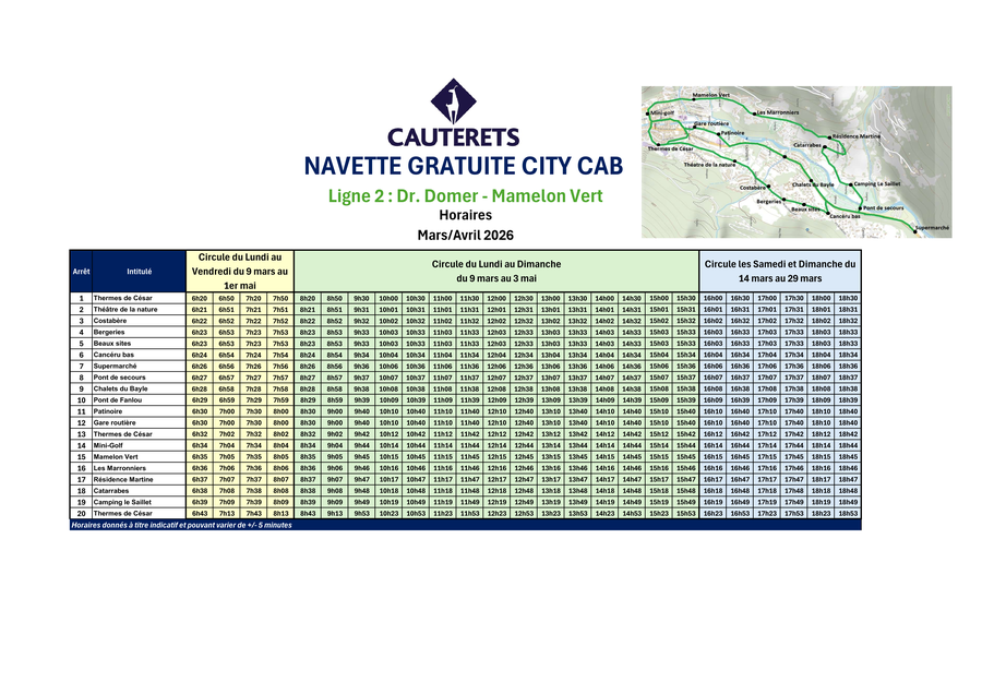 A partir du lundi 9 mars, la navette City Cab circulera sur la ligne 2 « Estivale » tous les jours jusqu’au 3 mai.