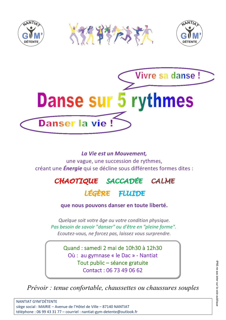 Nantiat Gym'Détente vous propose un moment unique de lâcher-prise et de liberté samedi 2 mai à 10h30 au gymnase le DAC.