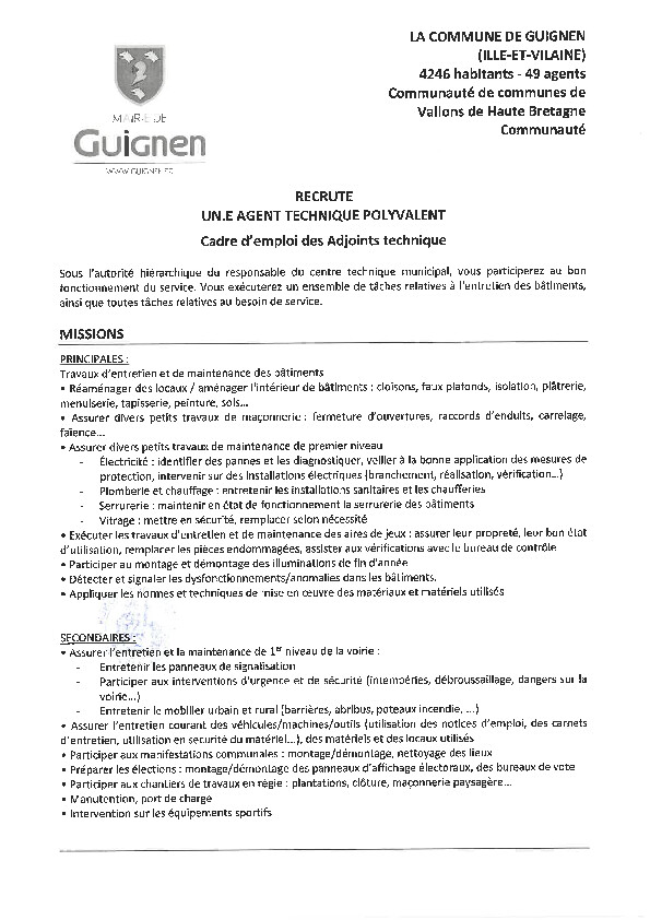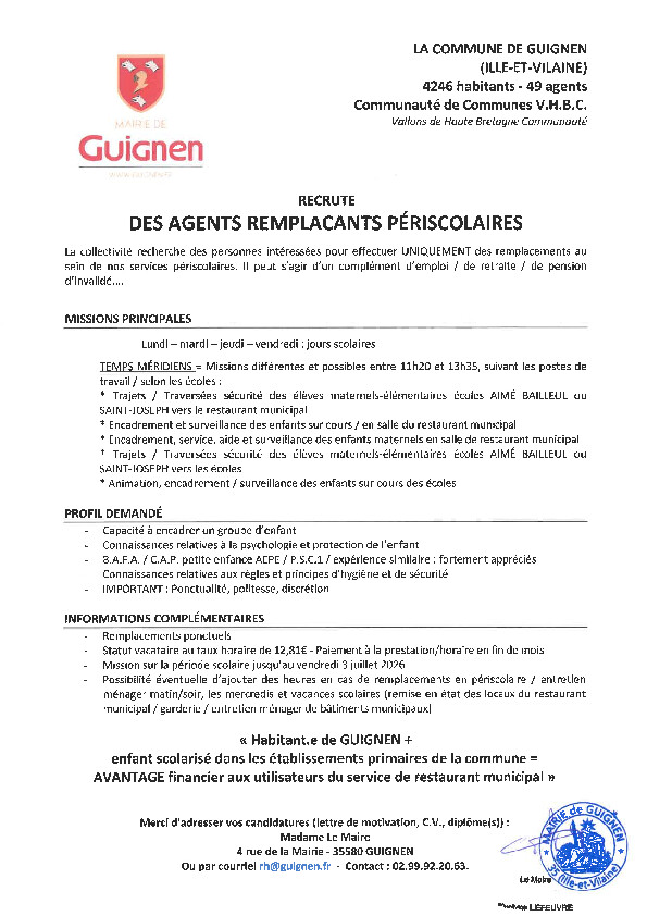 Le commissaire enquêteur se tiendra à la disposition du public à la Mairie de GUIGNEN les 15/09 de 9h à 12h, 27/09 de 10h à 12h et 17/10 de 14h à 17h. Le dossier est consultable à la Mairie de GUIGNEN et sur le site internet de la Préfecture