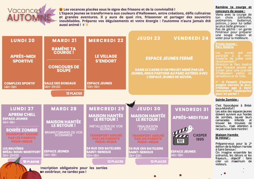 L'Espace Jeunes sera ouvert du 20 au 31/10/2025