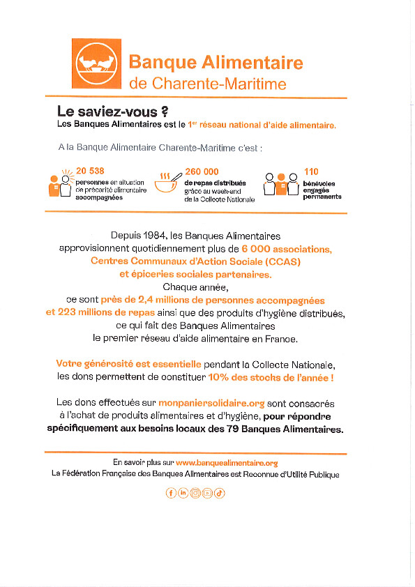 BANQUE ALIMENTAIRE DE CHARENTE-MARITIME accueille toutes les personnes de bonne volonté pour nous aider ponctuellement à l’automne et au printemps, ou plus si disponibilité.