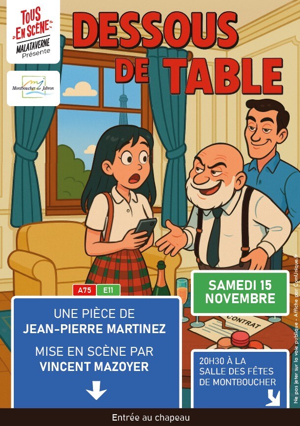 Le samedi 15 novembre 2025, la compagnie "Tous en Scène" vous propose la pièce de théâtre "Dessous de table" qui se déroulera à la salle des fêtes de Montboucher sur Jabron à 20h30