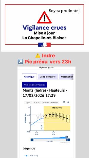âĄïž Ă 17h30, le pic de crue est estimĂ© aux alentours de 23h (donnĂ©es Vigicrues â station de Monts).
