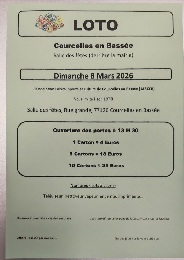 Un loto est organisé à la salle des fêtes de Courcelles en Bassée