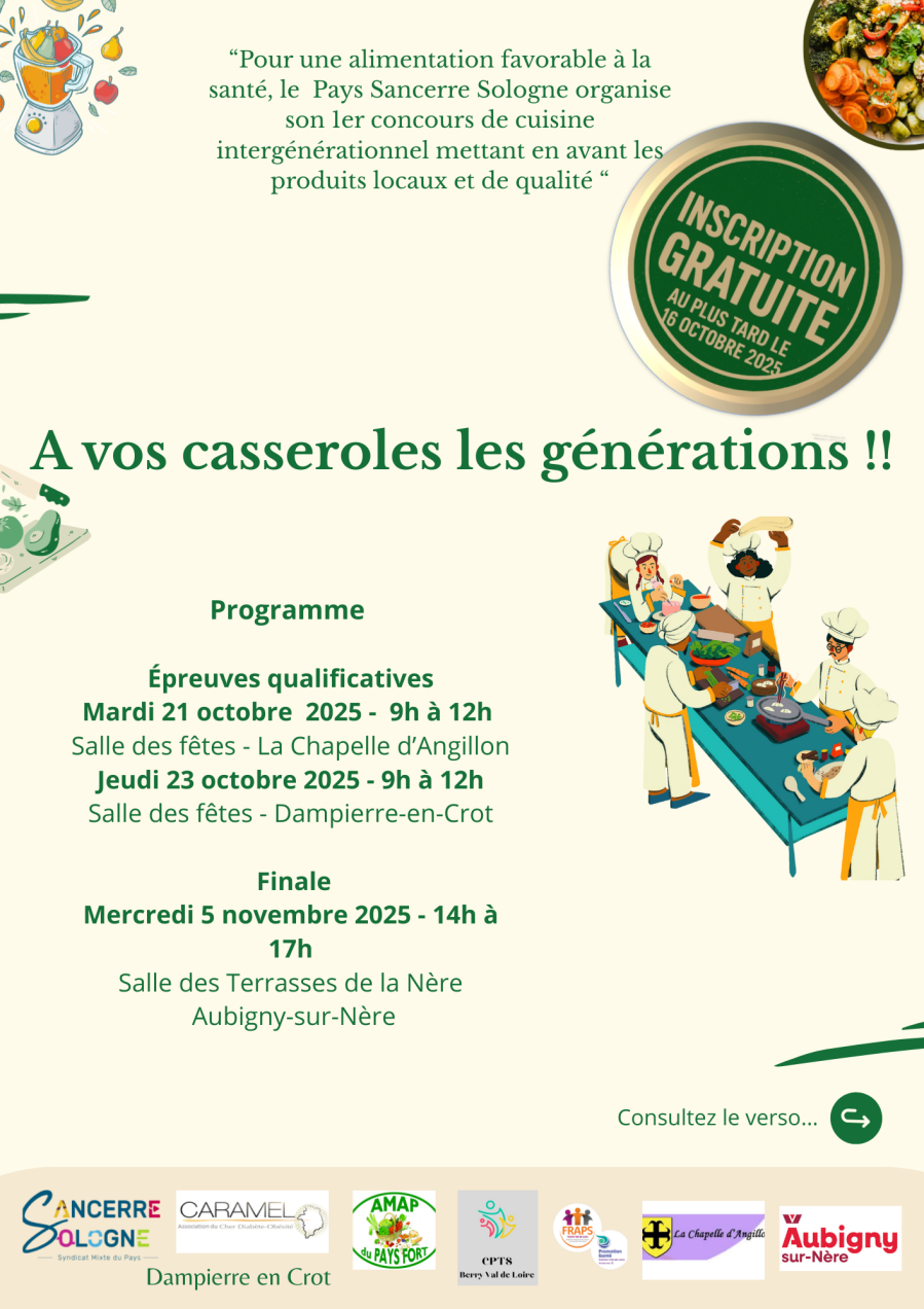 Le Pays Sancerre Sologne a le plaisir de vous informer de l’organisation d’un concours de cuisine intergénérationnel, ouvert à toutes et à tous, afin de valoriser le partage culinaire entre générations et la convivialité autour de la table.