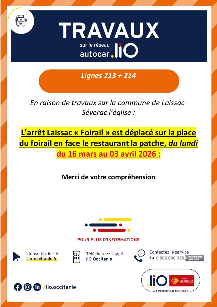 La Mairie de Laissac-Sévérac l’Eglise vous informe que des travaux de mise aux normes de l’accessibilité à la Résidence Services auront lieu à partir du 16 mars et pour une durée de 3 semaines (fin prévisionnelle le 3 avril). Ces travaux entraîneront la fermeture totale de la rue du Foirail à la circulation. Par conséquent, l’arrêt Laissac “Foirail” sera déplacé temporairement pendant toute la durée des travaux sur la place du Foirail, face au restaurant de la Patche. Pendant cette période, les autocars devront effectuer un demi-tour sur place afin de reprendre leur itinéraire habituel en direction de Rodez, Millau […]