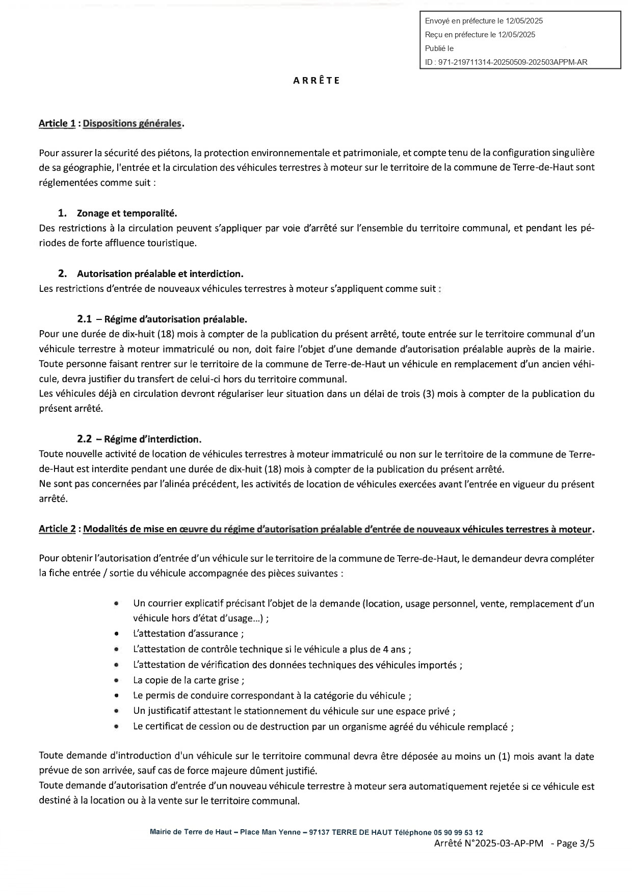 ✅ Autorisation obligatoire pour introduire tout nouveau véhicule terrestre à moteur (démarche en mairie 1 mois à l'avance). Les véhicules existants doivent se régulariser dans un délai de 3 mois.