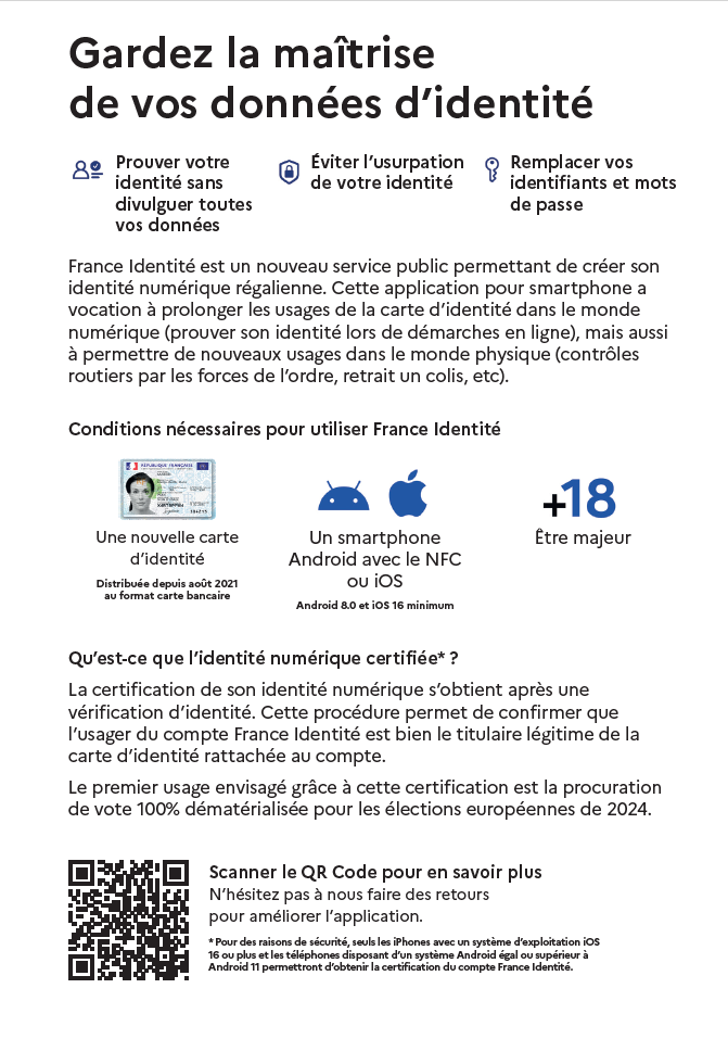 Ce service supplémentaire s’adresse aux personnes majeures disposant d’un smartphone compatible (Android 11 ou IOS 16 au minimum) et titulaires d’une carte d’identité dans son nouveau format (type CB).