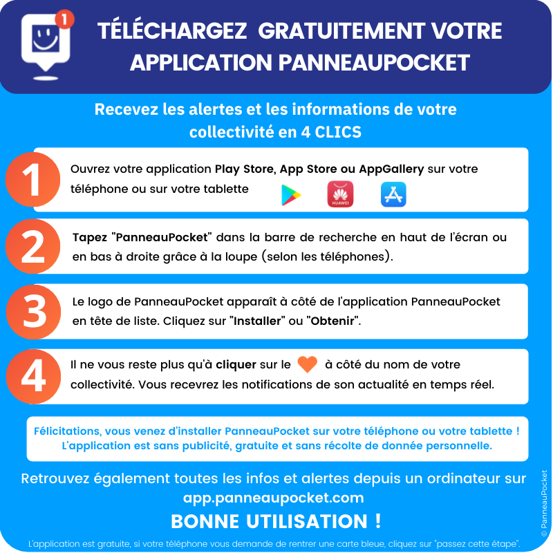 La commune est heureuse de mettre à disposition de ses habitants l’application PanneauPocket. Par cet outil très simple, elle souhaite tenir informés en temps réel les citoyens de son actualité au quotidien, et les alerter en cas de risques majeurs. Cette solution gratuite pour les habitants, sans récolte de données personnelles et sans publicité, permet d’établir un véritable lien privilégié entre le maire et ses citoyens.