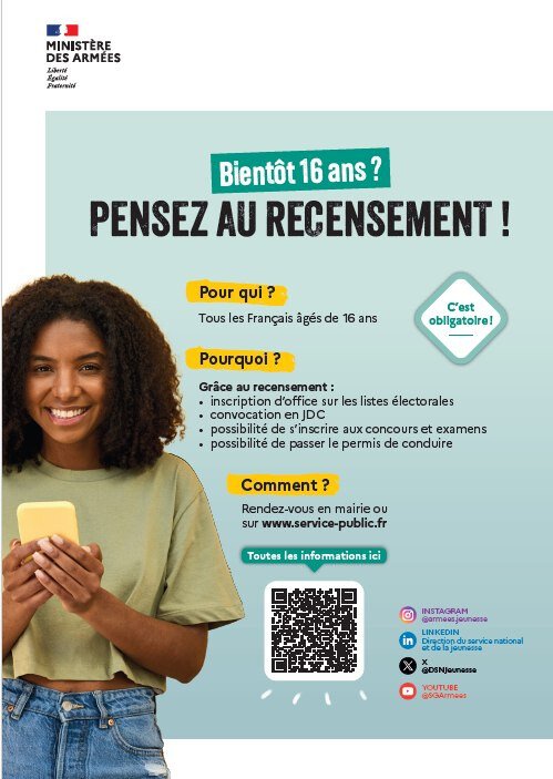 A partir de 16 ans (et dans les 3 mois qui suivent votre anniversaire), les jeunes de la commune doivent effectuer leur recensement citoyen ou militaire.