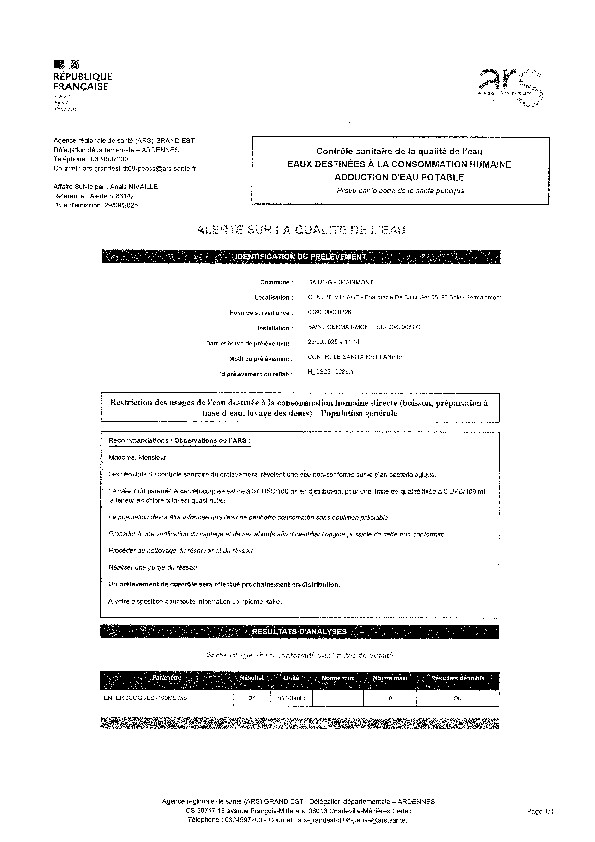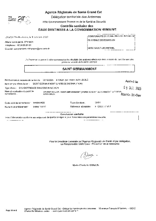 Les résultats des prélèvements réalisés le 03 octobre 2025 sur les réseaux de distribution de Saint-Germainmont révèlent des résultats conformes sur le plan bactériologique.