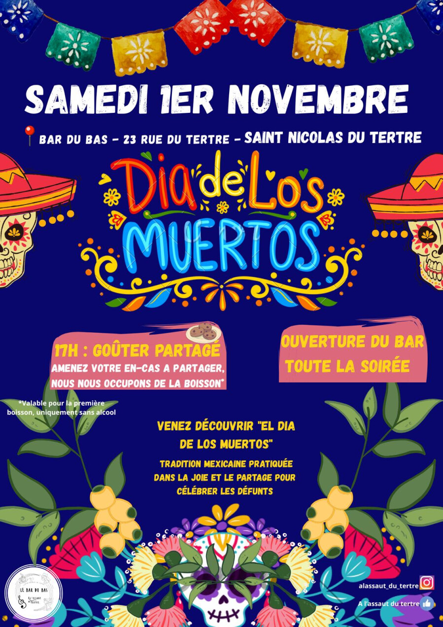 ✏️ Des coloriages seront mis à disposition afin de parfaire la décoration du bar sur le thème choisi pour l’occasion : El dia de los Muertos. Célébration d’origine mexicaine, la tradition veut que les vivants accueillent les disparus avec des activités qu’ils aimaient partager.🎊 Riche en couleurs, cette journée se déroule dans la bonne humeur afin de teinter les souvenirs simples en joie colorée. 🎶 En soirée, le Bar du Bas restera ouvert, des jeux de société, de la musique & des bénévoles enflammés vous y attendront !