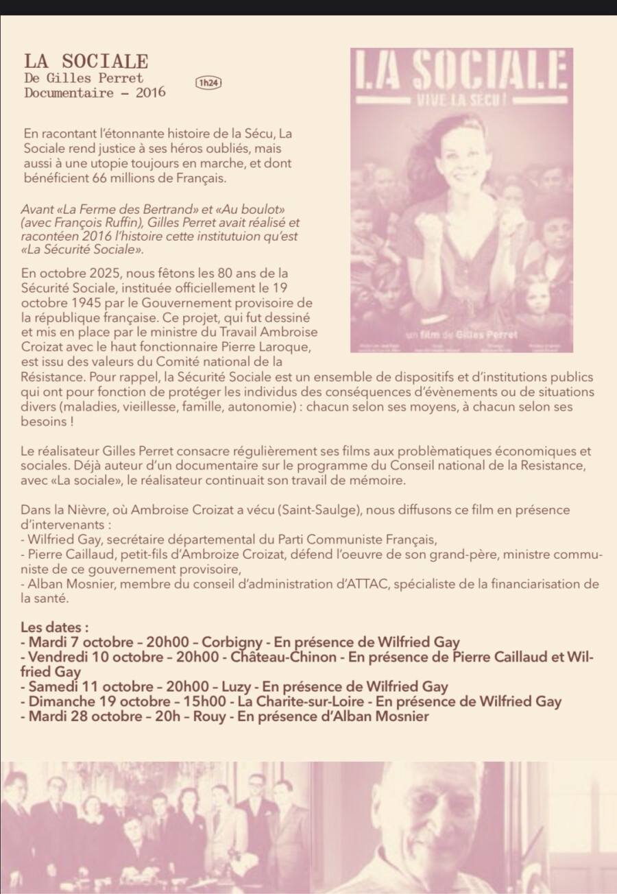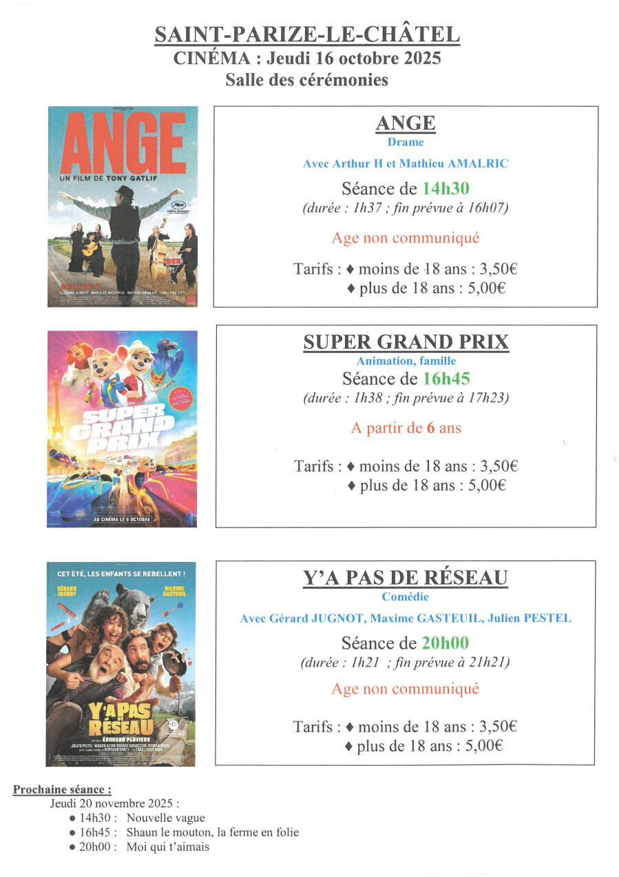 La prochaine séance du cinéma Itinérant à Saint-Parize-le-Châtel, aura lieu le jeudi 16 octobre 2025, salle des Cérémonies à la Mairie :
