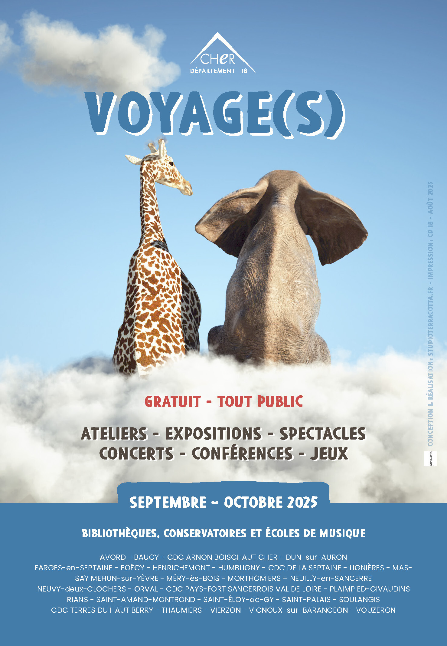 Du 11 septembre au 31 octobre 2025 le programme d'animations coordonnées Voyage(s) initié par la direction de la Culture du Département du Cher se déploie sur l'ensemble du territoire départemental.