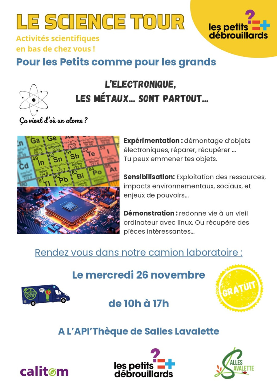 Le « Science Tour », 1er dispositif national itinérant d’éducation aux sciences fait escale à Salles Lavalette, à l'Api'Thèque, le mercredi 26 novembre de 10h à 17h avec son camion laboratoire.