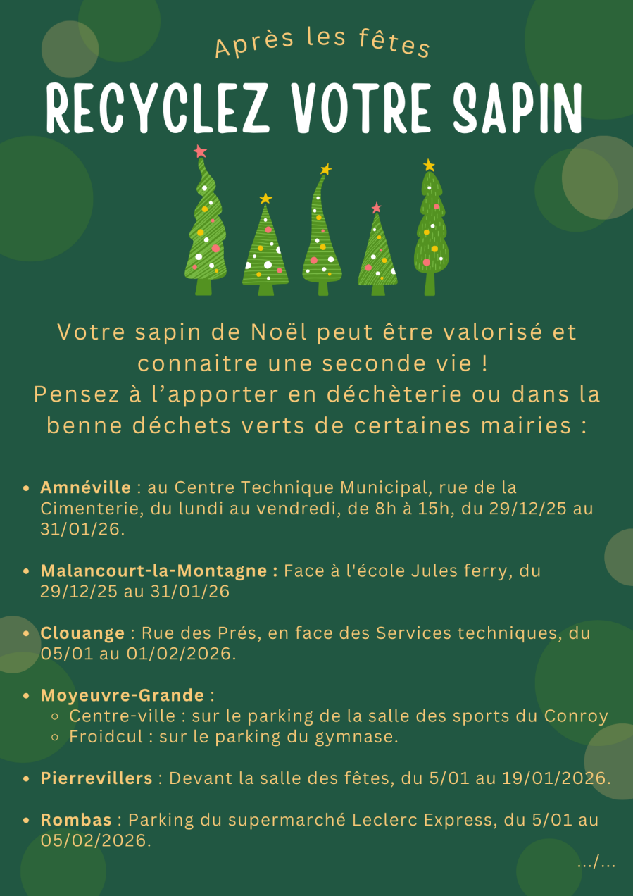 👉️ La collecte des ordures ménagères sera reportée au samedi 27 décembre 2025 pour les communes de Marange-Silvange secteur 2, Moyeuvre-Grande secteur 2 et Vitry-sur-Orne.