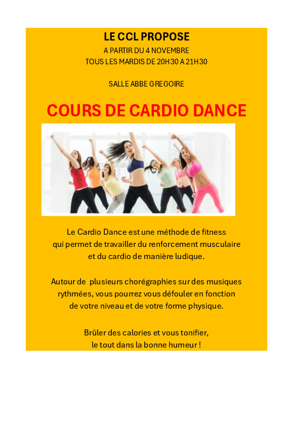 Le CCL propose un cours de cardio dance, salle Abbé Grégoire, tous les mardis de 20h30 à 21h30, à partir du 4 novembre