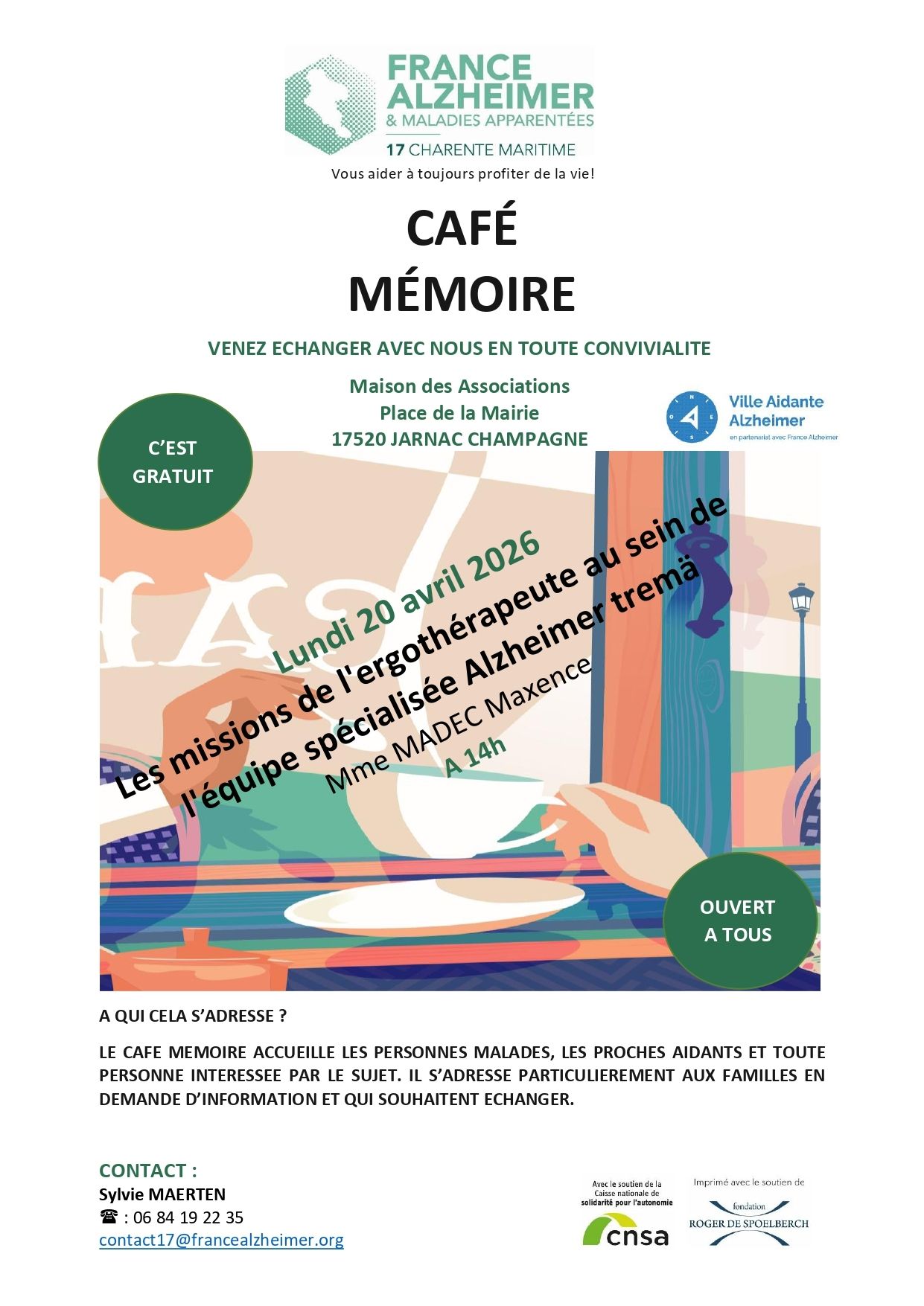 L’association France Alzheimer 17 organise un Café Mémoire, un moment d’échange convivial autour de la maladie d’Alzheimer et des maladies apparentées.