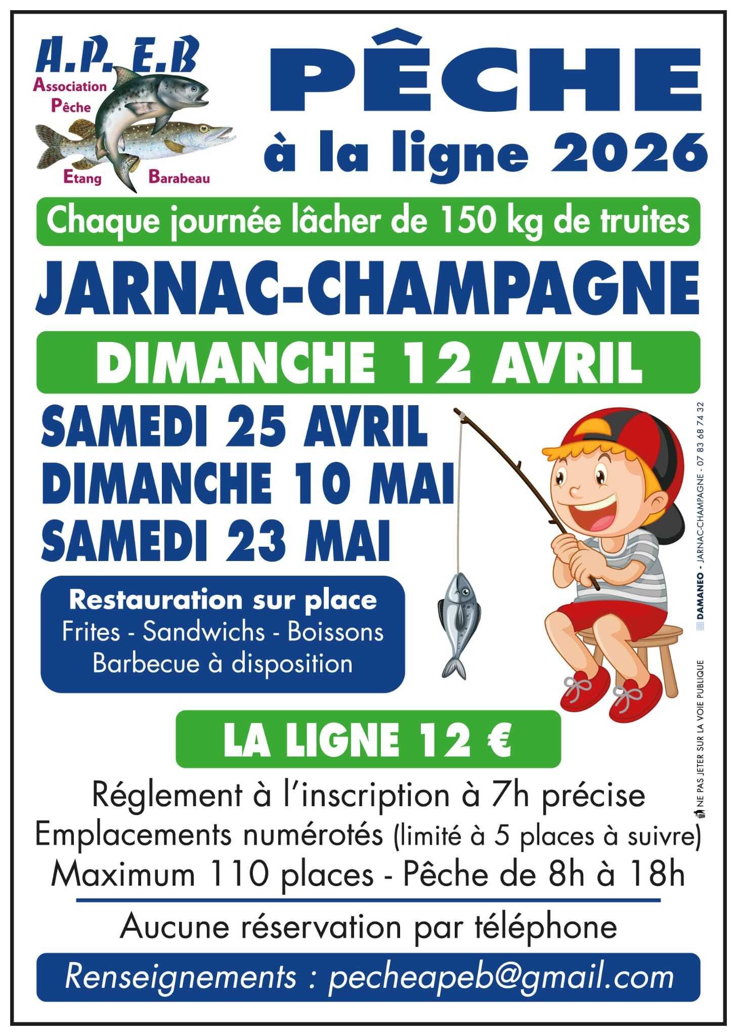 L’APEB (Association Pêche Étang Barabeau) organise plusieurs journées de pêche à la ligne à Jarnac-Champagne :