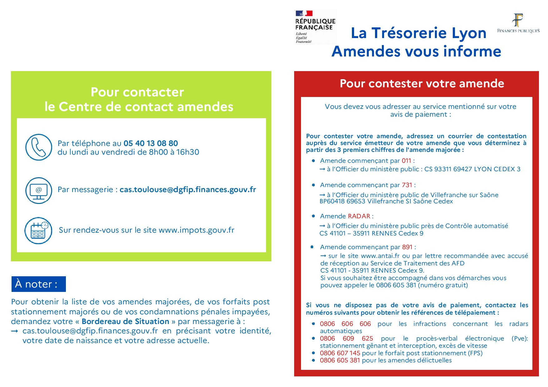 Depuis le 1er septembre 2025, les usagers de la Trésorerie Lyon amendes sont invités à contacter le Centre de contact amendes centralisateur de Toulouse pour tous types de demandes adressés par mail ou par téléphone: