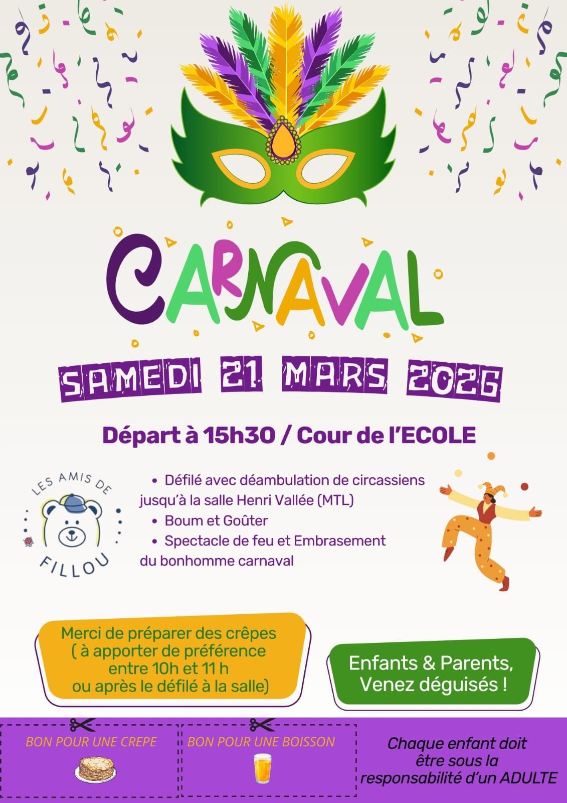 L’école Rosa Bonheur et l’APE Les Amis de Fillou organisent le carnaval de la commune le samedi 21 mars 2026.