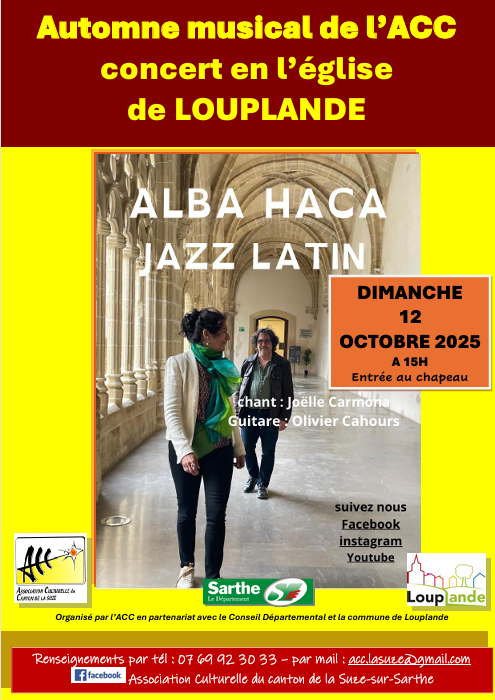 L’association culturelle du canton de la Suze (ACC), en association avec la commune de Louplande, est heureuse de vous présenter Alba Haca, un duo formé par Joëlle Carmona et Olivier Cahours.