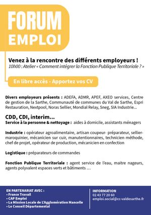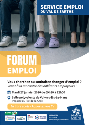 Le service Emploi de la Communauté de communes du Val de Sarthe organise un Forum Emploi le mardi 27 janvier de 09h30 à 12h00 à la salle polyvalente de Voivres-lès-Le-Mans.
