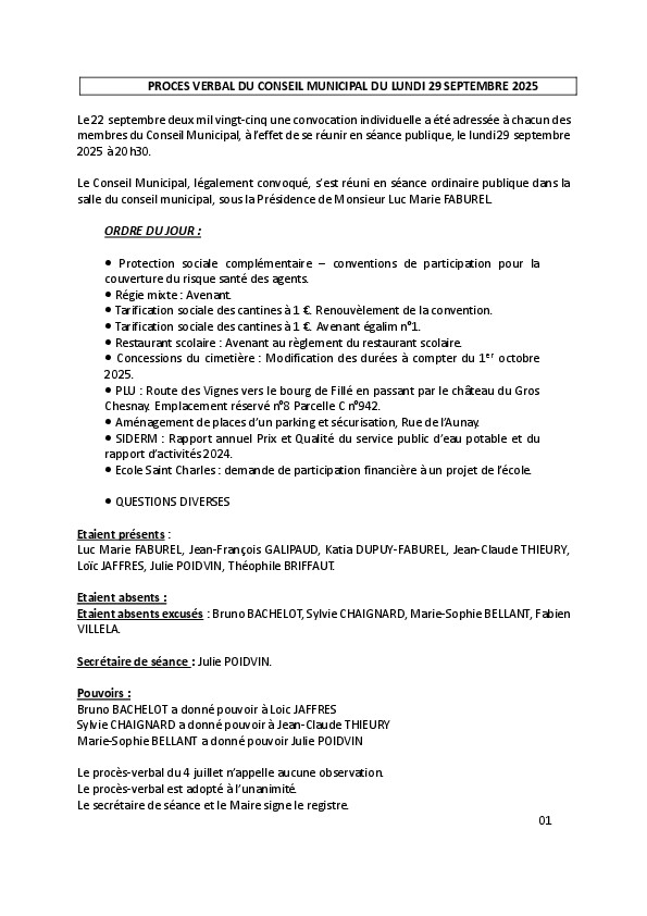 Veuillez trouver ci-joint le procès verbal du conseil municipal du