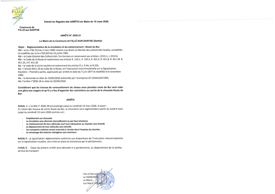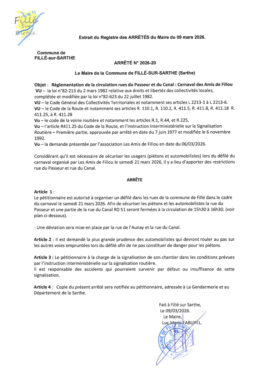 L’arrêté 2026‑20 réglemente la circulation le samedi 21/03, de 15 h 30 à 16 h 30, rue du Passeur ainsi que sur une partie de la rue du Canal (RD 51), à l’occasion du carnaval des Amis de Fillou.