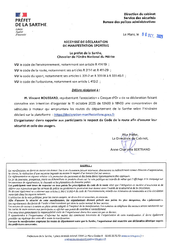 L’association « Casque d’Or », représentée par M. Vincent BOUSSARD, informe le public de l’organisation d’une concentration de véhicules à moteur