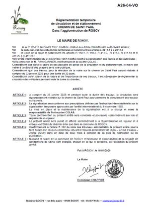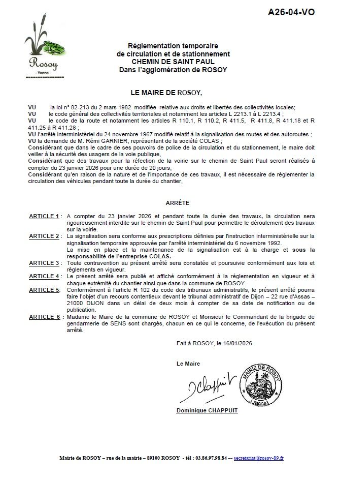 Dans le cadre de la poursuite des travaux de réfection de la voirie, la circulation sera interdite sur le chemin de Saint Paul, à compter du 23 janvier 2026 et pendant toute la durée des travaux (voir arrêté en pj).