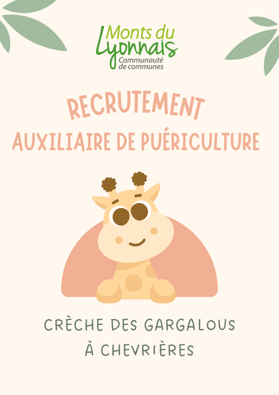 La Communauté de communes des Monts du Lyonnais recrute un(e) auxiliaire de puériculture pour intervenir auprès des enfants de 2 mois ½ à 4 ans.