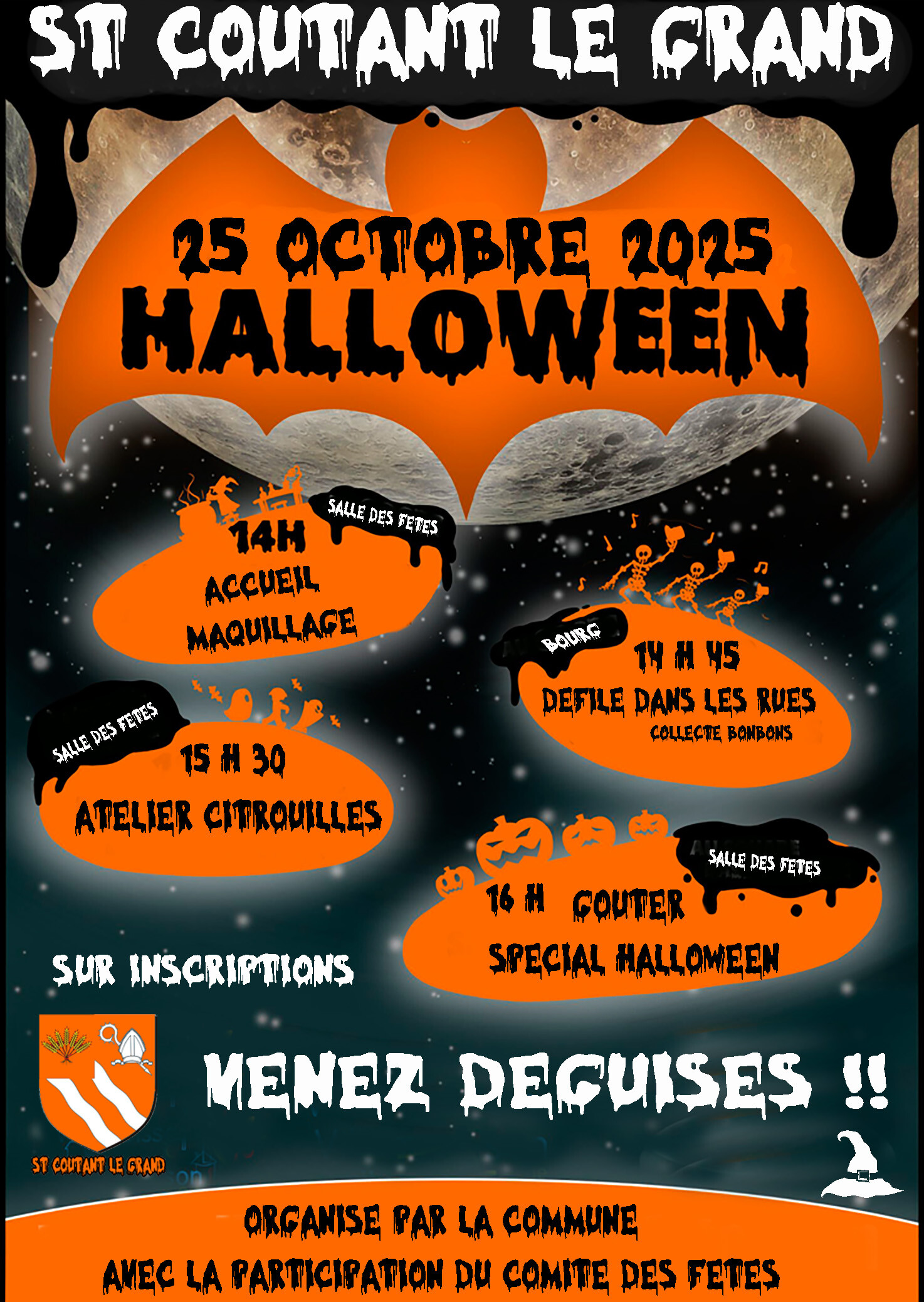 Comme chaque année, le commune de St COUTANT le GRAND et le COMITÉ des FÊTES organisent une animation à l'occasion d'Halloween. Maquillage, défilé dans les rues pour la collecte de bonbons et atelier "CITROUILLES" sont au programme, sans oublier le goûter Spécial HALLOWEEN.