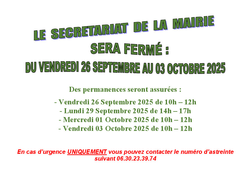 En dehors des horaires d’ouverture des services de la mairie et en cas d’URGENCE, vous pouvez joindre l’élu de permanence au