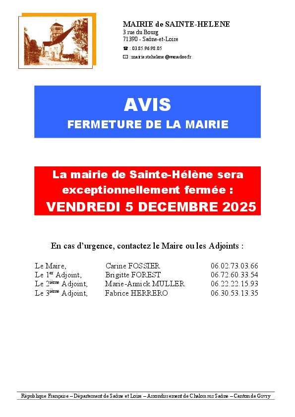 Si vous avez constaté des dommages sur votre bien, nous vous invitons à vous faire connaître auprès de la mairie avant le 14 décembre 2025 en envoyant ces éléments par courriel à mairie.stehelene@wanadoo.fr, avec comme objet "Reconnaissance catastrophe naturelle".