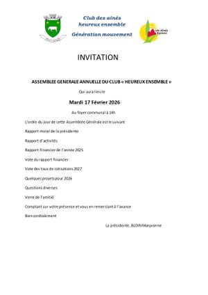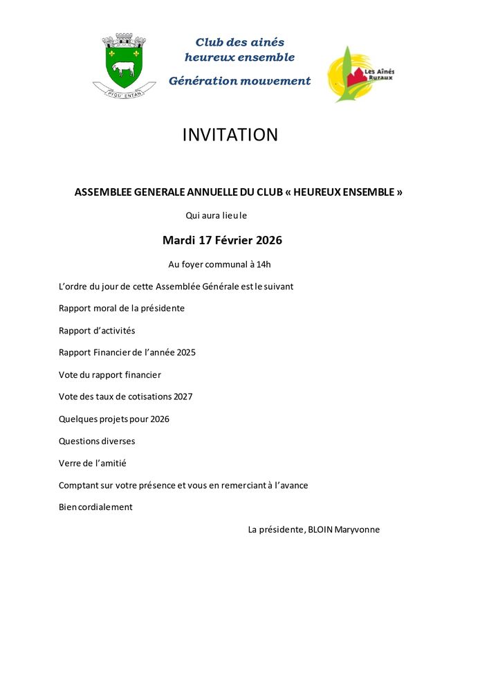 Vous êtes invités à l'assemblée générale du club des Ainés Ruraux le mardi 17 février à 14h au foyer communal.