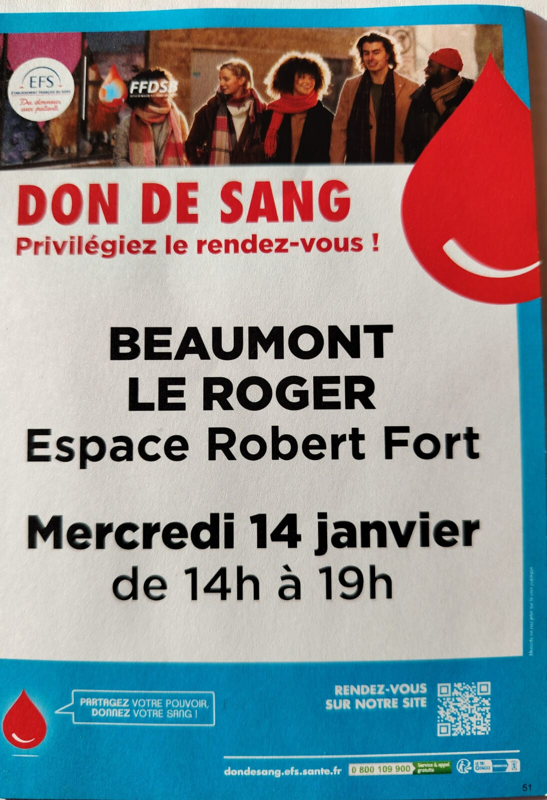 La collecte de sang est de retour à Beaumont le Roger le mercredi 14 janvier 2026 de 14h00 à 19h00 en l'espace Robert Fort.