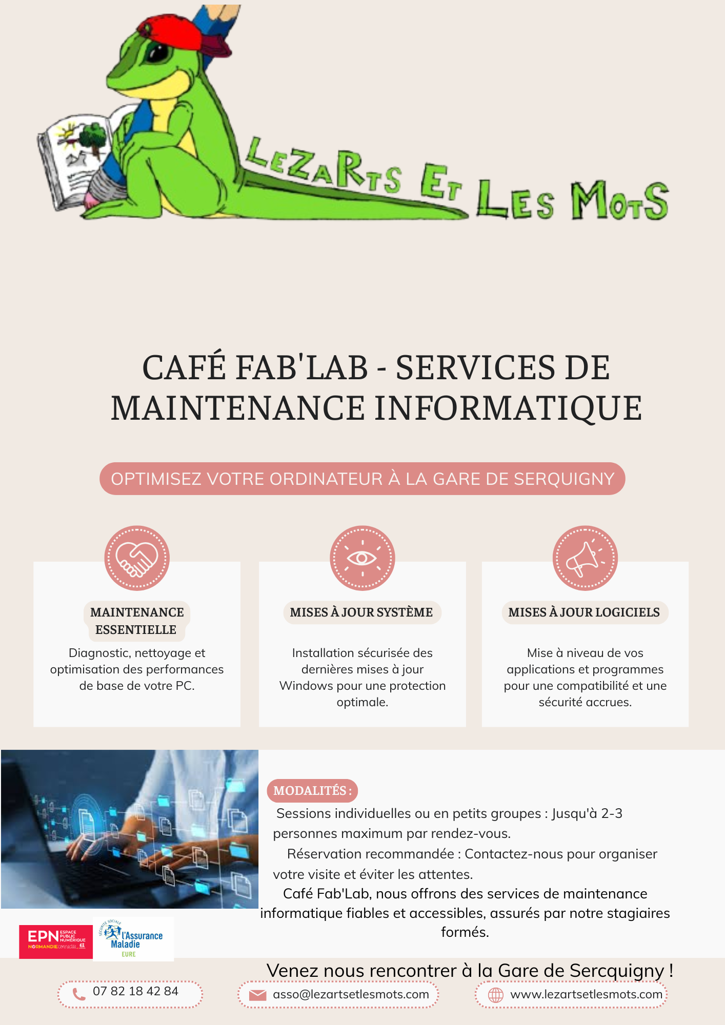 Le Café Fab’Lab de l’association Lezarts et les Mots vous propose désormais un service de maintenance informatique, ouvert à tous.
