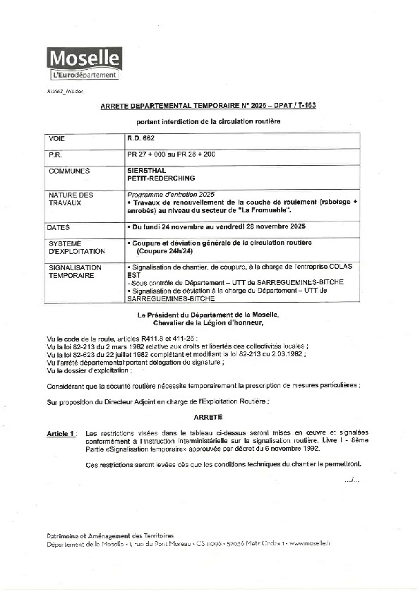 La réalisation des travaux prévue du lundi 24 au mercredi 26 novembre 2025 (semaine 48 ) nécessitera une coupure totale de la circulation 24h/24 de ce tronçon routier.