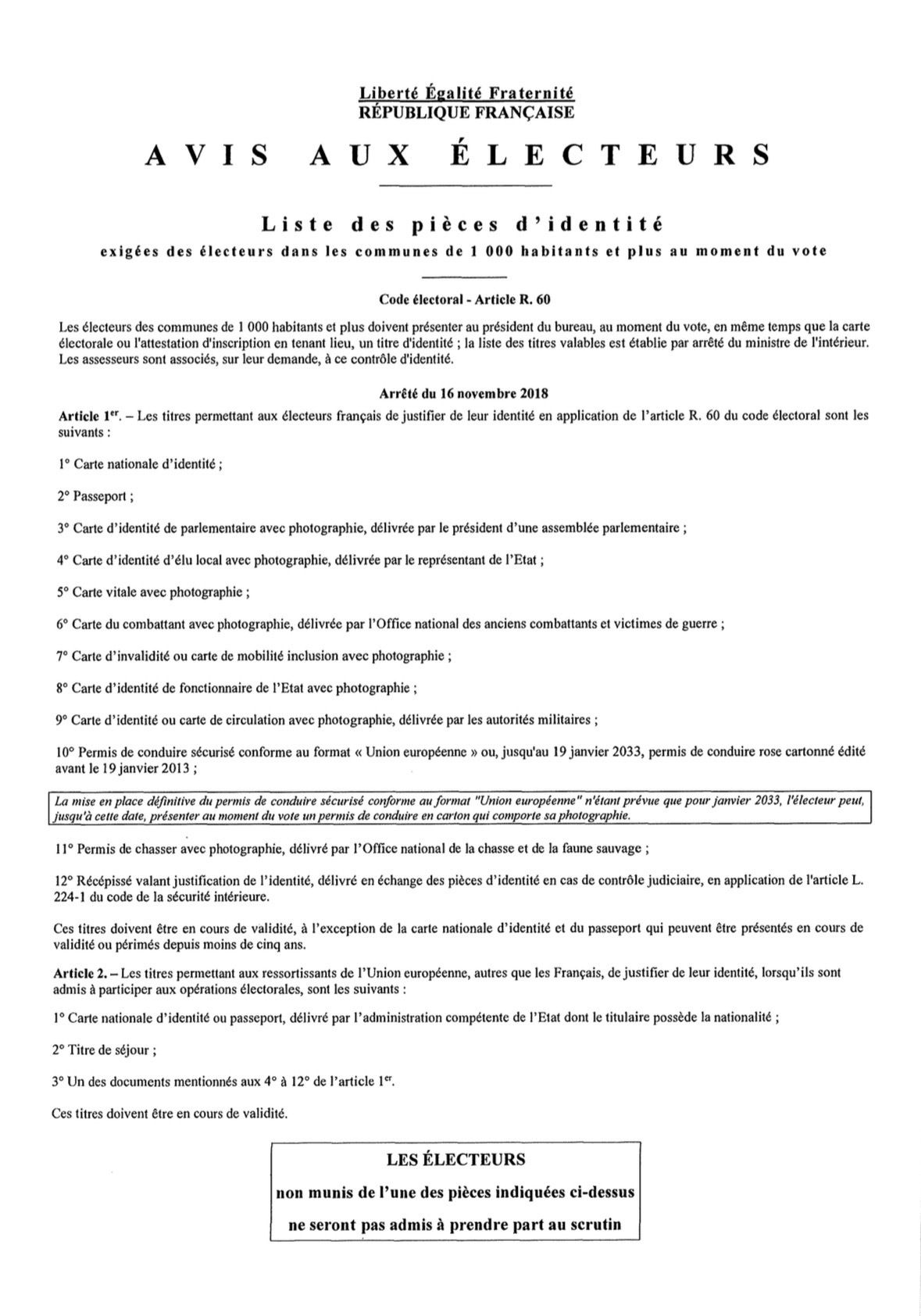 Ci-jointe la liste des pièces d’identité exigées pour le vote.