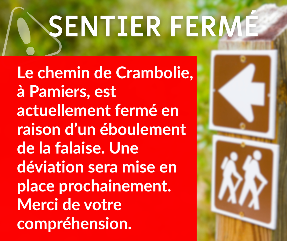 Suite à un éboulement de la falaise, le sentier de randonnée du Chemin de Crambolie est fermé au public jusqu’à nouvel ordre pour des raisons de sécurité.