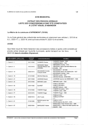 A titre d’information, la liste des concessions dont l’état visuel d’abandon a été constaté, est déposée et tenue à la disposition du public en mairie, à la Préfecture