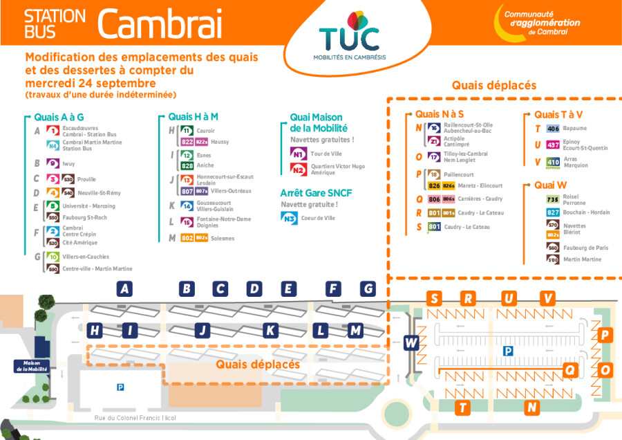 Pour cette raison :Les quais de bus situés entre N et V ne peuvent plus être utilisés.Les bus sont provisoirement accueillis sur le parking de l’IFSI / LADAPT, où plusieurs rangées de stationnement sont neutralisées.