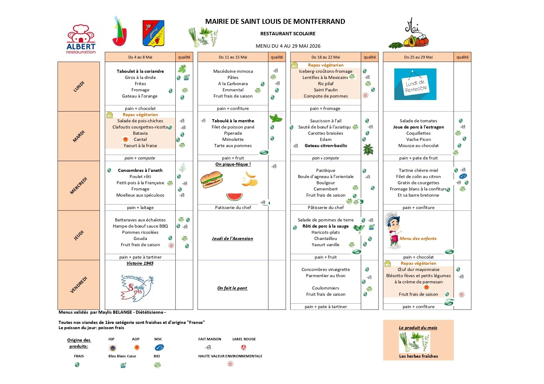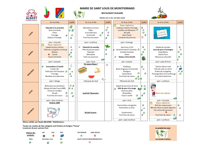 Voici les menus de la cantine scolaire du mois de mai 2026🥦 🍐🥘